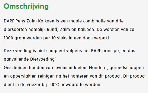 Info van Darf: Deze Darf producten zijn niet compleet. Echter wel een goede toevoeging aan de dagelijkse maaltijden en een aanrader om regelmatig mee af te wisselen. In deze producten zitten twee diersoorten en 40% pens.