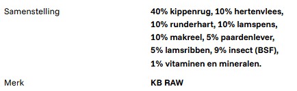 KB Complete Multi Mix bevat wel 7 verschillende eiwitbronnen: 40% kippenrug, 10% hertenvlees, 10% runderhart, 10% lamspens, 10% makreel, 5% paardenlever, 5% lamsribben, 9% insect (BSF), 1% vitaminen en mineralen.